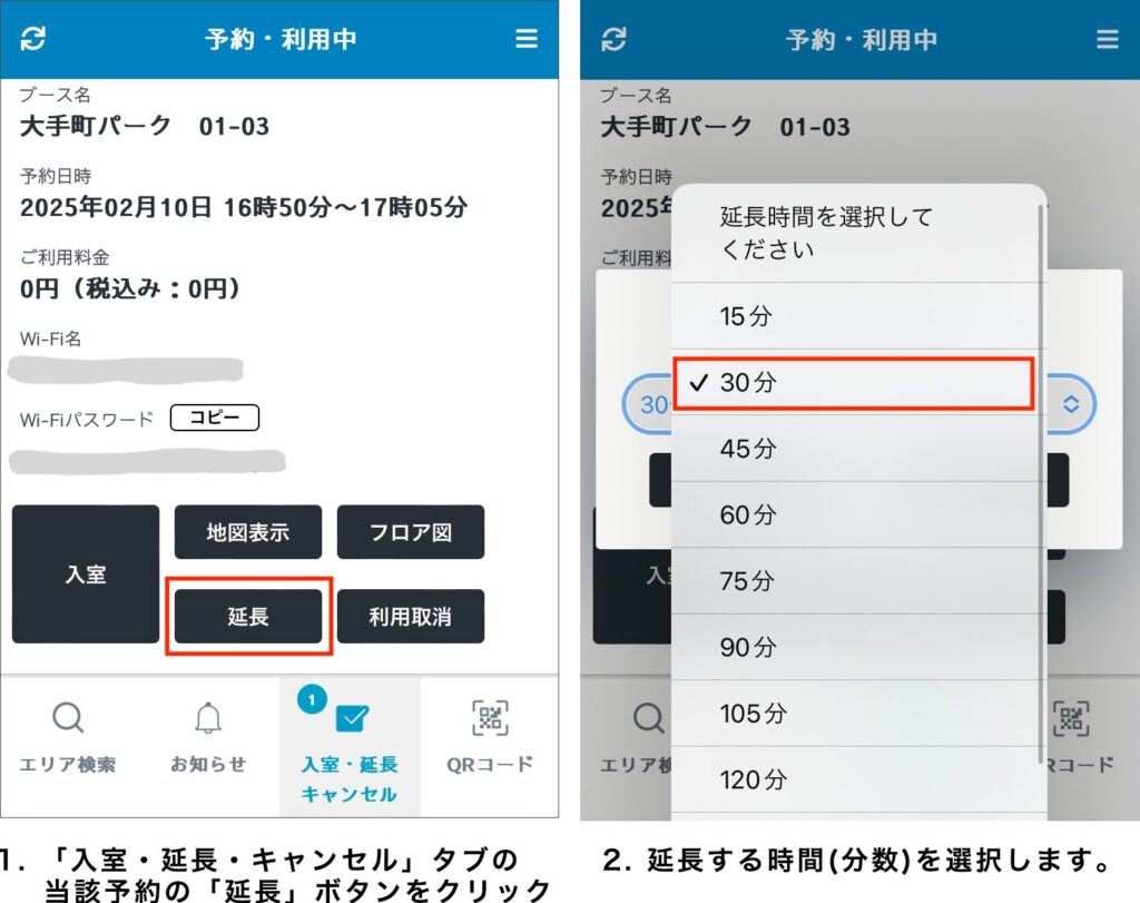 ご利用前、もしくは、ご利用時間内に「入室・延長・キャンセル」タブ