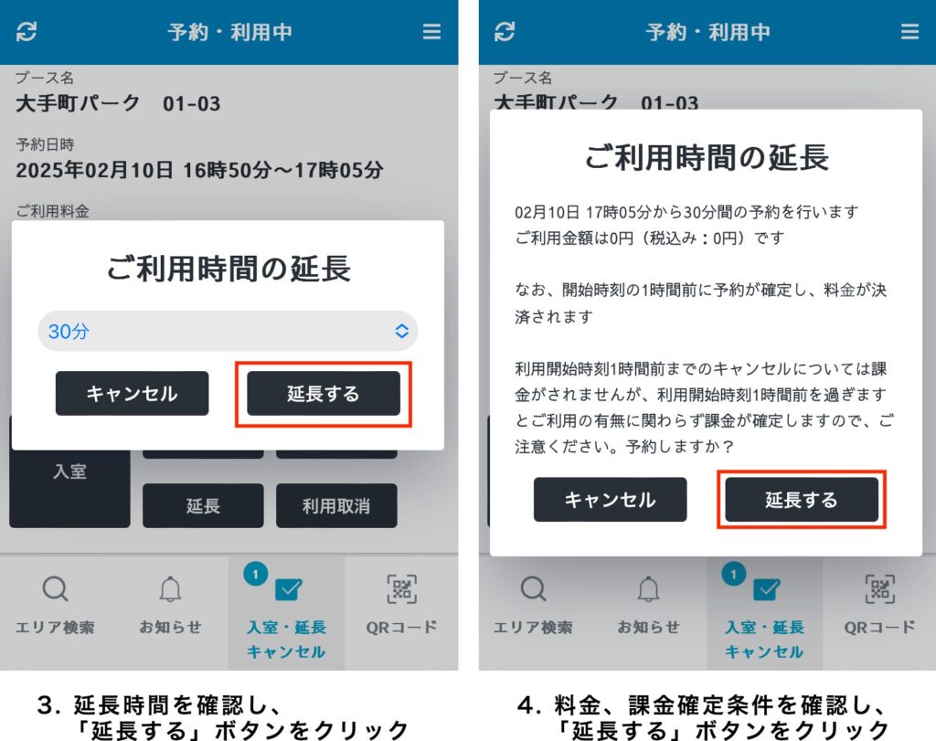 にて、 延長ボタンにより予約延長が可能です。